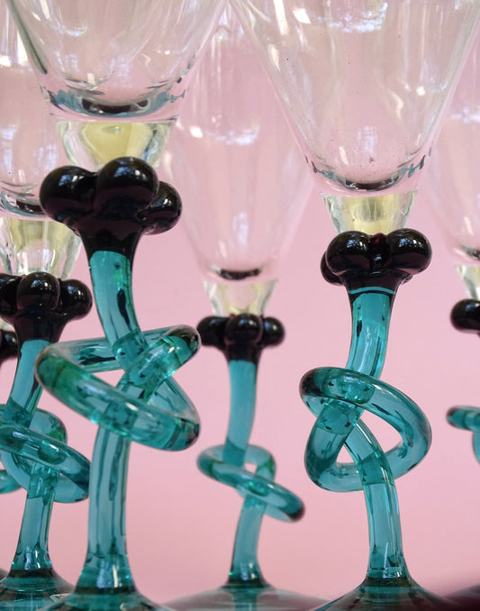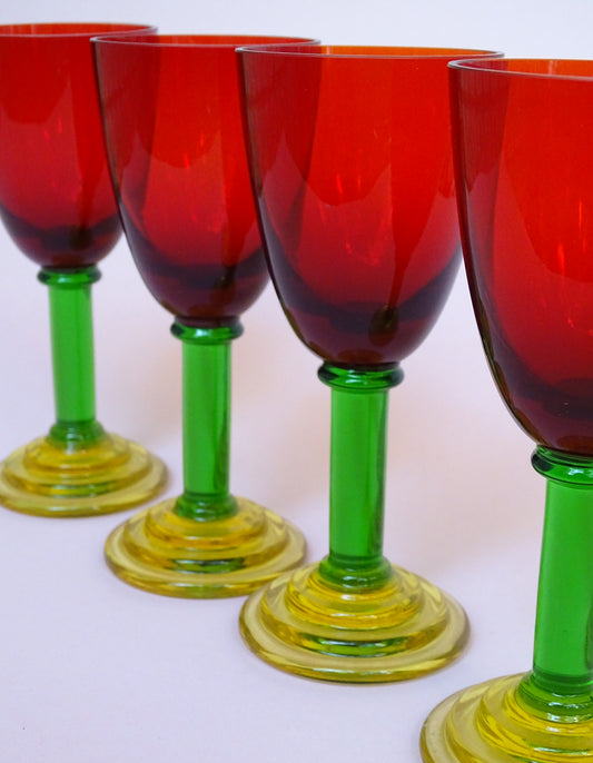 Vintage, set of 4 tall glasses with green stems for wine